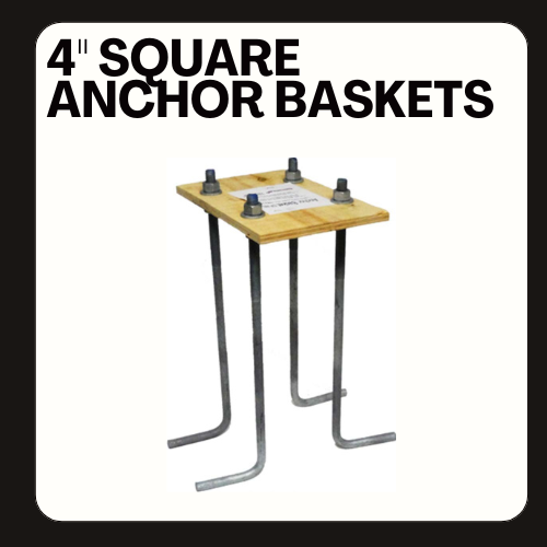 Anchor baskets are required when anchoring into a poured foundation. We make anchor baskets which serve several purposes, to make it easy to set a pole onto the proper bolts. The anchor baskets use a plywood template in order to hold the correct Bolt Circle Diameter (BCD), and the correct bolt and thread projection (how far above the concrete the bolts stick out). This insures that the washers and nuts fit onto the J-Bolts with enough room to tighten them properly, but not too far, so that the bolt covers fit onto the base.